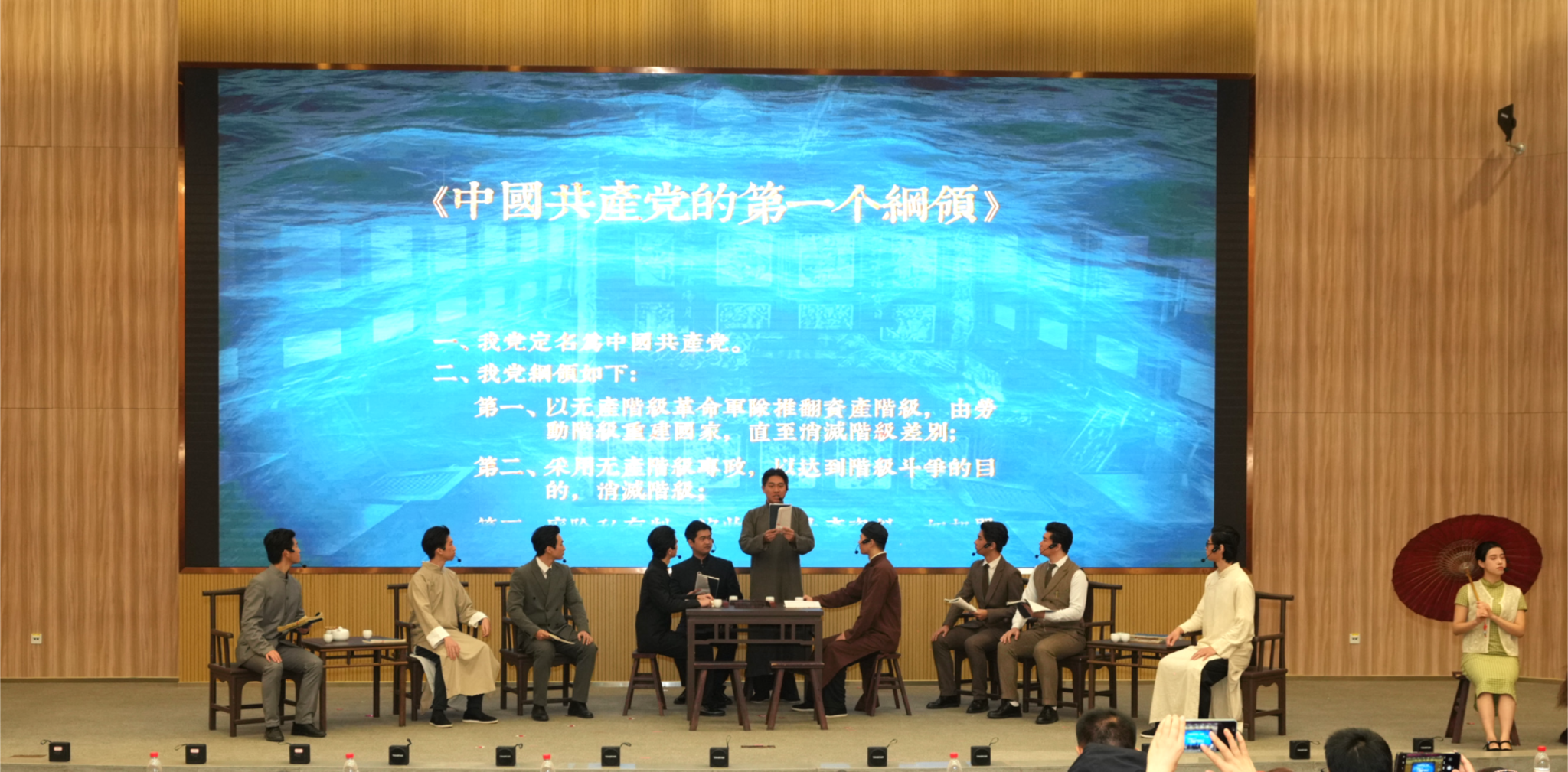 学生现场表演红色话剧《初心》片段,以“沉浸式”演绎引领全场观众重温中国共产党成立的伟大时刻,使红船精神与建党初心的信仰力量直抵人心,在艺术形式中实现了红色基因的生动传承。