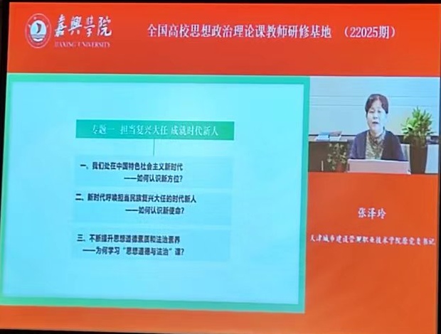 院长冯秀军教授、天津城市建设管理职业技术学院张泽玲教授、嘉兴学院经济学院顾骅珊教授、红船精神研究中心孙宝根教授分别以“专题一的整体教学设计““高职高专教学特点有机融入思路”“新时代共同富裕的浙江探索”“中共正式创建与伟大建党精神”为主题讲授理论课。教学展示环节,复旦大学副教授张奇峰、辽阳职业技术学院讲师解雅梦分别进行了专题一的示范说课。