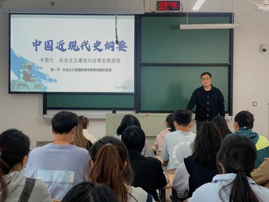 公开课首先在尚德楼143教室举行,王磊老师执教了《中国近现代史纲要》课程的专题教学,内容为专题九“社会主义建设与改革发展进程”的第一节“社会主义道路的艰辛探索和曲折发展”。王老师备课认真充分,课件内容丰富翔实,形式多样。在上课过程中,王老师教学仪态大方,语言清晰流畅,课堂节奏收放自如、把控得当。特别是能够充分运用现代化多媒体手段,引导学生积极思考,启发带动学生参与课堂活动,对学生的疑问和困惑进行耐心细致的解答,圆满完成了教学任务。