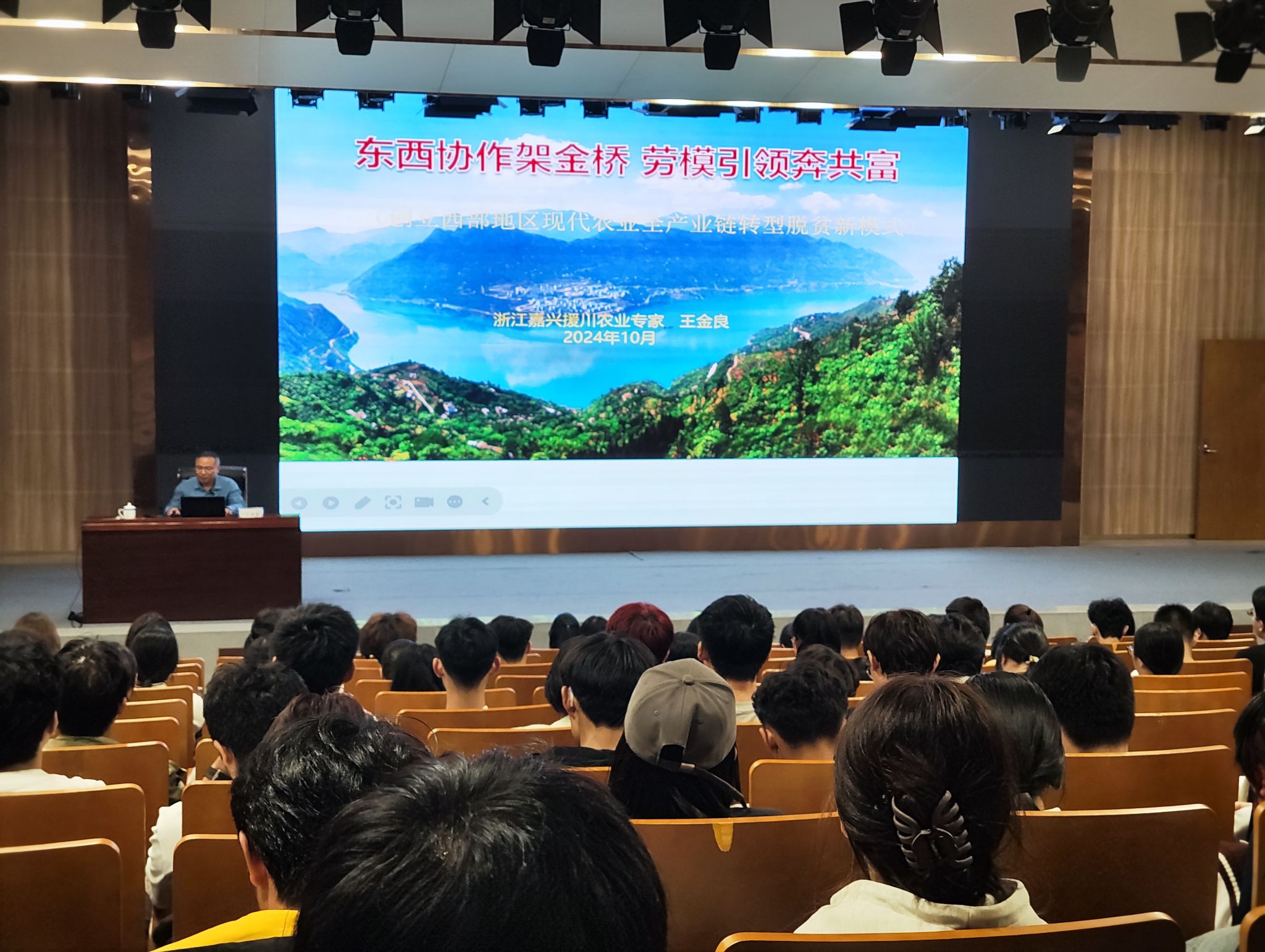 2024109日下午,由做爱自拍 、做爱自拍 红船精神传承名师工作室、做爱自拍 德法教研室主办的“劳模进课堂”系列讲座在校图书馆一楼报告厅举行,本次课邀请了全国先进工作者、全国“五一”劳动奖章获得者援川农业专家王金良为大家作题为“东西协作架金桥,劳模引领奔共富”的讲座。