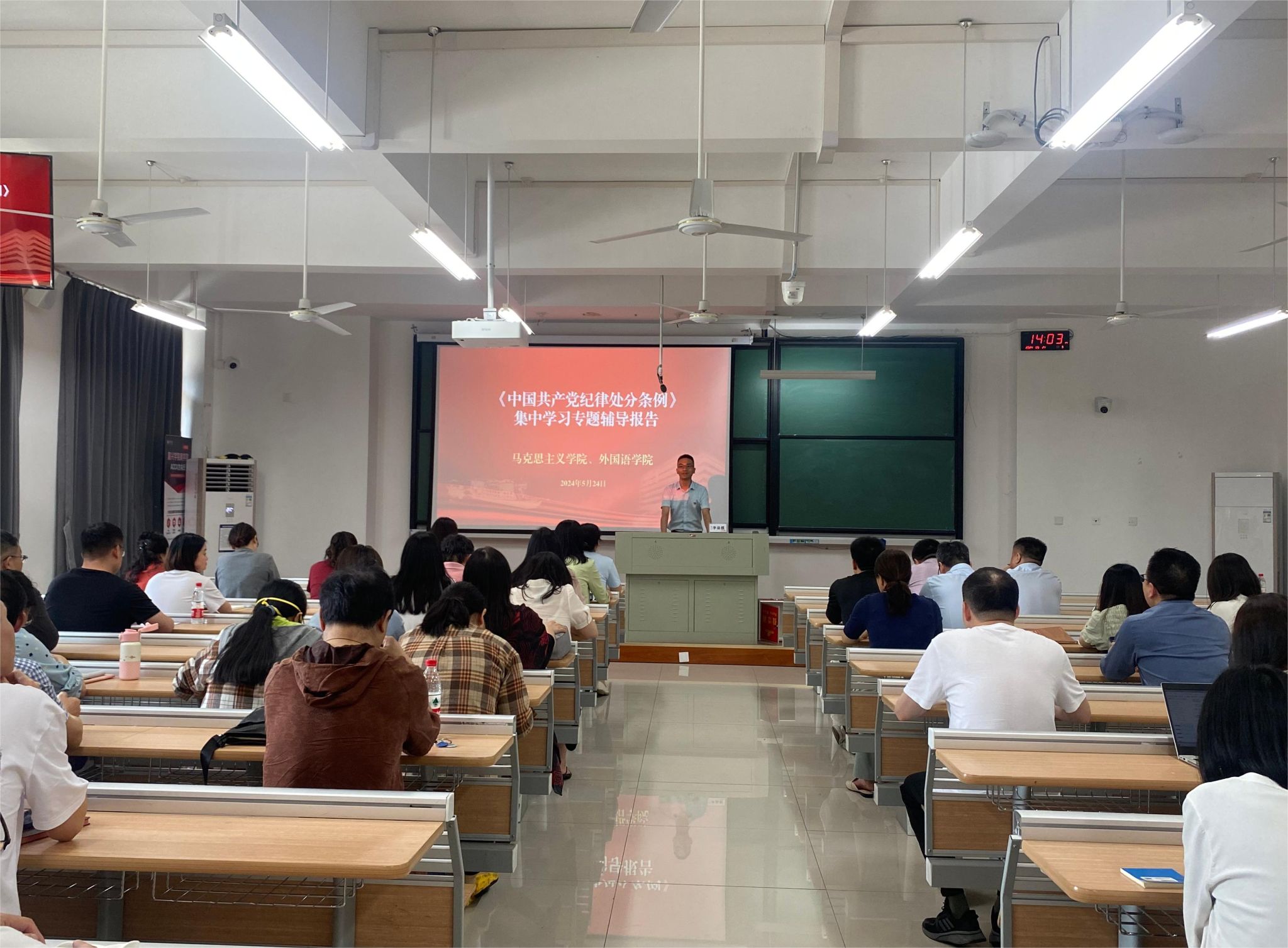 与外国语学院联合开展主题党日暨《中国共产党纪律处分条例》专题辅导讲座,讲座邀请了浙江红船干部学院李益模副教授对新修订的《条例》进行专题解读。学院党总支书记宋之霞主持会议,全体党员参加学习。